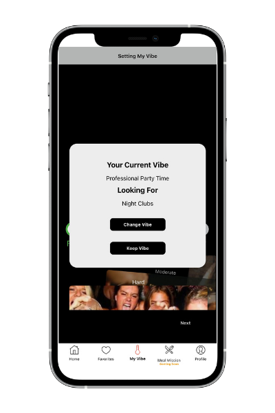 When you first open the app you will be asked to set your vibe. We have you answer a few questions that help determine the best places that fit where you’re looking to start your night. Swipe to set your vibe!